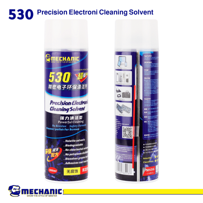 - فعالية في إزالة بقايا التدفق: يعتبر سبراي ميكانيك 530 فعالًا بشكل خاص في إذابة وإزالة بقايا التدفق التي تتخلف بعد عمليات اللحام، وهي بقايا يمكن أن تسبب مشاكل في الأداء إذا لم يتم تنظيفها.