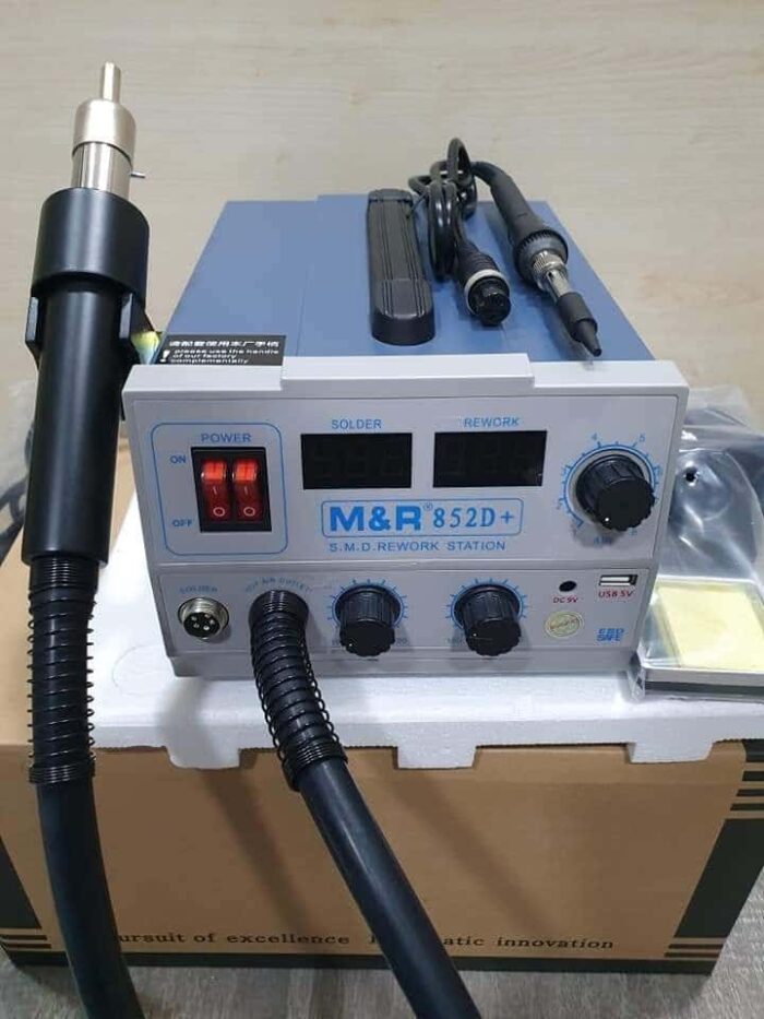 هوت اير MR 852D+ هو محطة لحام هواء ساخن احترافية تستخدم لتسخين المكونات الإلكترونية ولوحات الدوائر باستخدام تيار من الهواء الساخن يمكن التحكم في درجة حرارته وسرعة تدفقه. تُستخدم بشكل أساسي لفك وتركيب المكونات الإلكترونية السطحية (SMD).
