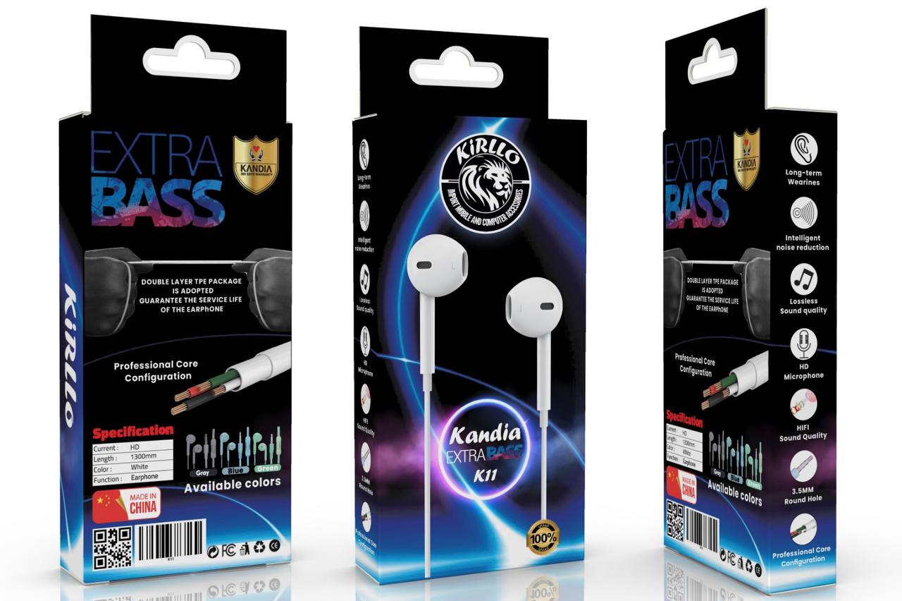 تتميز سماعة EARPHONE hands free HeadPhone عضم Kandia بتصميم مريح للغاية (عضم)، جودة صوت EXTRA BASS نقية، ميكروفون HD، تقنية عزل الضوضاء الذكية، ومواد تصنيع عالية الجودة مثل TPE لضمان المتانة وطول العمر.